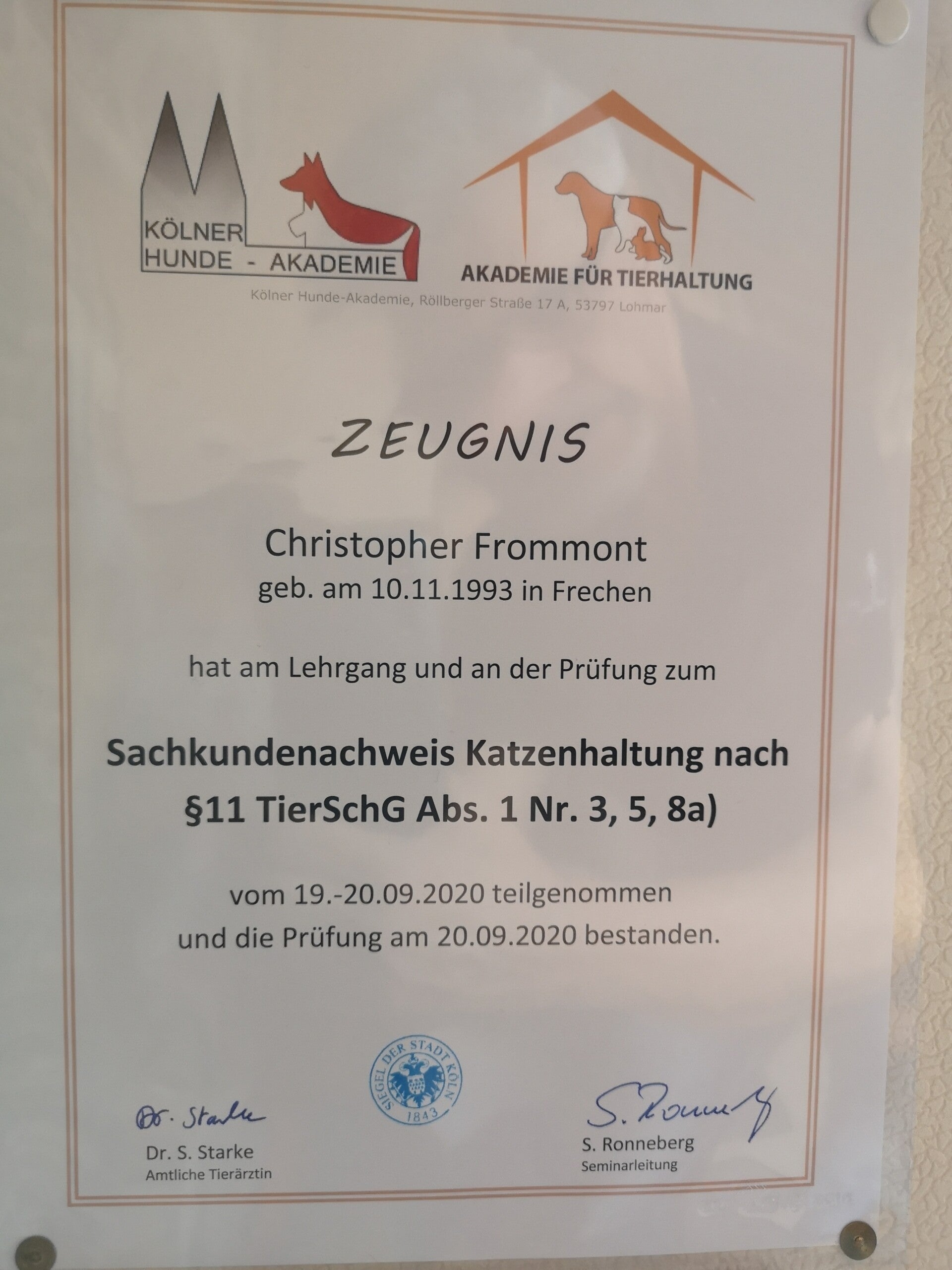 Alle 4 Betreuer unseres Teams sind ausgebildete Katzenhalter und zusätzlich ein Tierpsychologe.Hier sehen sie die Zeugnisse: